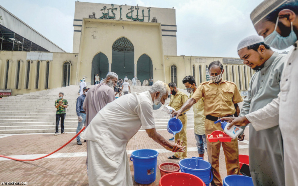 بدأت بنجلاديش تخفيف الإغلاق العام المرتبط بانتشار وباء كورونا لكنها فرضت إجراءات وقائية لإعادة فتح المساجد.. وفي الصورة التي التقطت أمس يساعد أفراد تأمين رجلاً مسنًا على غسل وتعقيم يديه قبل الدخول إلى مسجد بيت المكرم في دكا العاصمة البنجلاديشية
