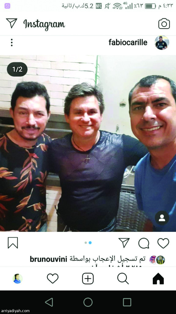 شارك البرازيلي فابيو كاريلي مدرب فريق الاتحاد الأول لكرة القدم متابعيه عبر حسابه على إنستجرام بصورة سيلفي أخذها مع اثنين مع أصدقائه، فيما علق بقوله “مع الثنائي الرائع العظيم”.