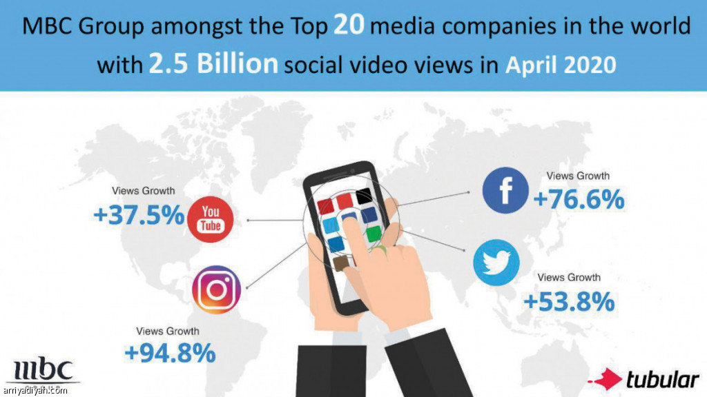 انضمّت “مجموعة MBC” إلى قائمة الشركات الإعلامية الـ 20 الأكثر مشاهدةً حول العالم لمحتوى الفيديو عبر وسائل التواصل الاجتماعي، وذلك وفقًا لأحدث النتائج الصادرة عنTubular Labs العالمية المتخصصة، لشهر إبريل 2020. ووفقًا للتقرير الذي صدر حديثًا عن Tubular Labs، المؤسسة العالمية المتخصّصة بقياس وتحليل وتصنيف نِسب مُشاهدة الفيديوهات على مختلف المنصّات الرقمية ومواقع التواصل الاجتماعي، فقد حققت “مجموعة MBC” نموًا كبيرًا مقارنة بشهر مارس من العام الحالي 2020، إذ قفزت 13 مركزًا، لتنتقل بذلك من المركز الـ 32 إلى المركز الـ 19، وتدخل ضمن قائمة “العشرين” أكثر المنصات الإعلامية والترفيهية العالمية مشاهدةً.   وأوضحت المجموعة في بيان لها أنه يتّضح من معدلات النمو الكبيرة هذه بأنها تعكس موسم الذروة الرمضاني وعيّنة من بضعة أيام للأداء المتفوق لقنوات MBC التلفزيونية في منطقة الشرق الأوسط خلال شهر رمضان. وعلى سبيل المثال لا الحصر، حصدت MBC أكثر من 50% من الحصة السوقية للمشاهدة في السعودية. .