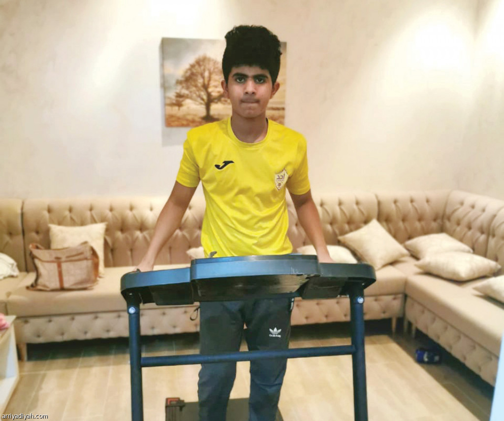 يستعين يوسف المرواني، لاعب فريق أحد للناشئين لكرة القدم، بجهاز السير الكهربائي لأداء تدريبات المشي والجري في منزله عقب تعليق النشاط الرياضي بسبب جائحة فيروس كورونا.