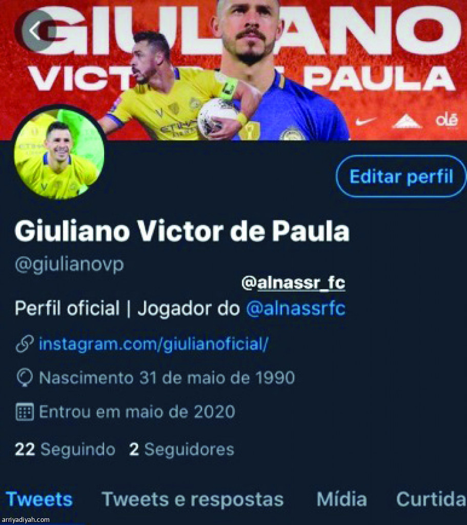 انضم البرازيلي جوليانو، لاعب فريق النصر الأول لكرة القدم، إلى موقع التواصل الاجتماعي “تويتر”، من خلال تدشين حساب له.