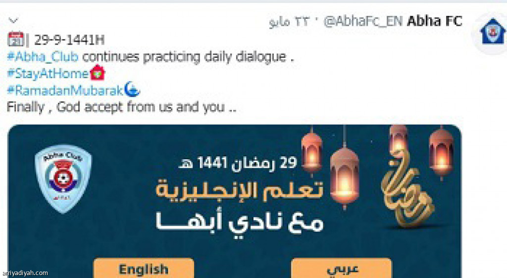 اختتم حساب نادي أبها باللغة الإنجليزية، على موقع التواصل الاجتماعي “تويتر”، دورة اللغة الإنجليزية التي انطلقت أول رمضان واستمرت لمدة 29 يومًا.