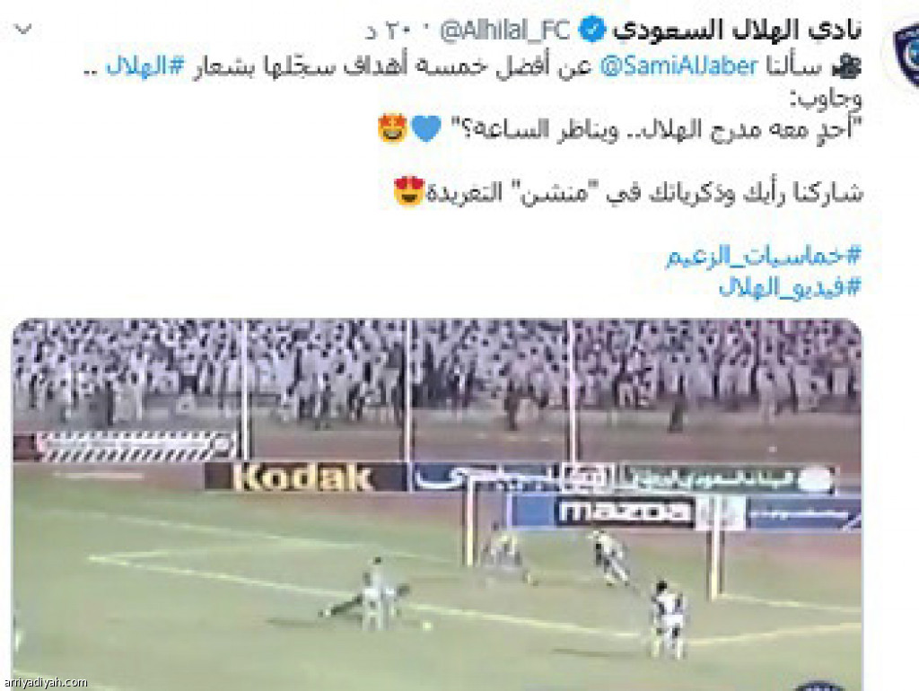 حظي فيديو حسابات نادي الهلال، على منصات السوشال ميديا، التي ظهر فيها سامي الجابر، قائد الفريق السابق، يتحدث عن أفضل خمسة أهداف في مسيرته بمشاهدات عالية وتفاعل كبير. وأوضح الجابر في الفيديو، الذي جاء تحت عنوان “خماسيات الزعيم”، أن من أفضل أهدافه كان في مباراة اعتزال صالح النعيمة، زميله السابق، التي لعب فيها الهلال أمام نجوم العالم. وبلغت مشاهدات الفيديو 260 ألفًا،خلال 3 ساعات. وعبر الطائر الأزرق، وصلت الردود على تغريدة الفيديو 900، مقابل 4800 ريتويت، ,4300 تفضيل.
