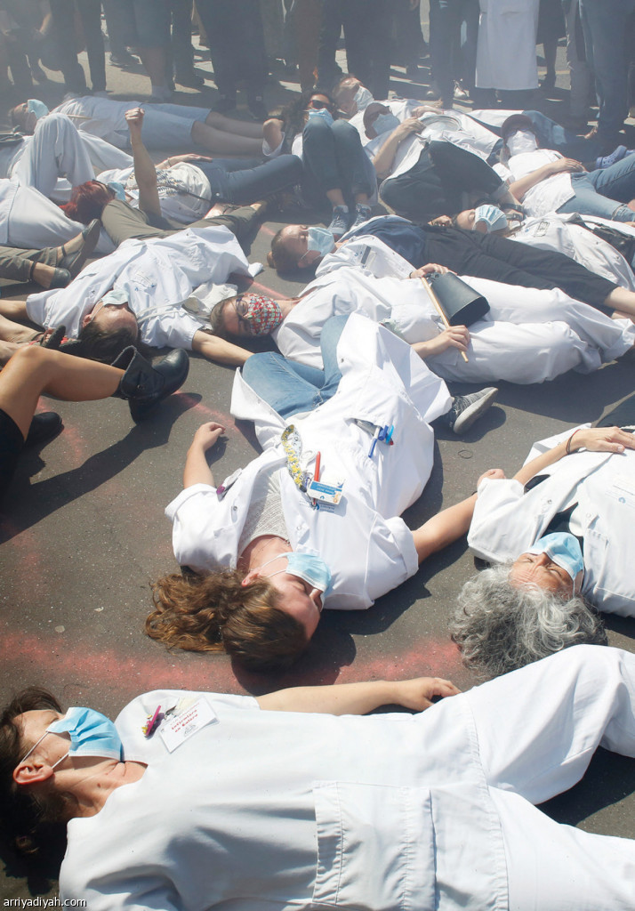 نظّم الطاقم الطبي في مستشفى روبرت ديبري في باريس طريقة جديدة للاحتجاجات تتمثل في الاستلقاء على الأرض لفترة محدودة من الزمن للفت نظر المسؤولين لتنفيذ مطالبهم المتمثلة في زيادة أجورهم مع المخاطر التي يتعرضون لها في ظل انتشار فيروس كورونا..