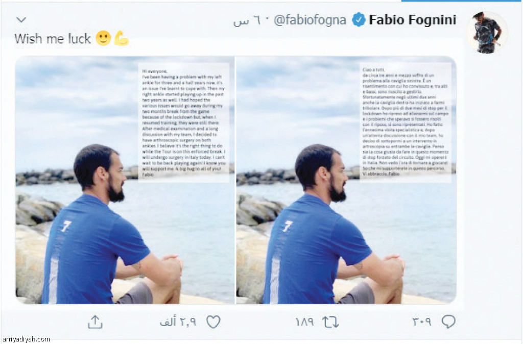 دعا الإيطالي فابيو فونيني لاعب تنس المضرب متابعي حسابه على تويتر إلى مساندته والدعاء له بالشفاء بعد أن خضع إلى جراحة في كاحليه أمس لعلاج مشكلة يعانيها منذ ثلاثة أعوام ونصف العام، لكنه كان يتعايش معها. وأوضح المصنف الحادي عشر في قائمة الاتحاد الدولي للتنس في بيان أمس على تويتر أنه كان يأمل أن تتحسن الحالة خلال فترة توقف البطولات بسبب تفشي فيروس كورونا، إلا أنه قرر الخضوع إلى جراحة بالمنظار لحل المشكلة تمامًا.