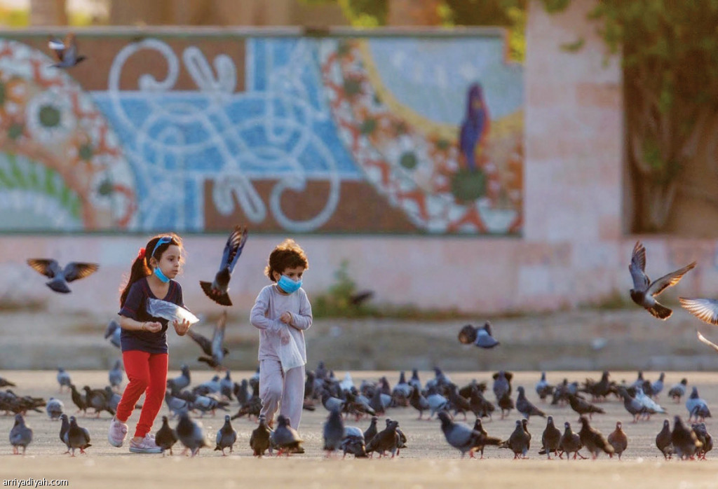 توجهت العائلات في مدينة جدة إلى الواجهة البحرية للترفيه عن أنفسها وأطفالها بعد فترة طويلة بسبب الإجراءات الصحية التي اتخذتها السلطات بفرض منع التجول أغلب ساعات اليوم للحد من انتشار فيروس كورونا المستجد..صورة طفلان يوزعان بعض أنواع الحبوب لإطعام الحمام