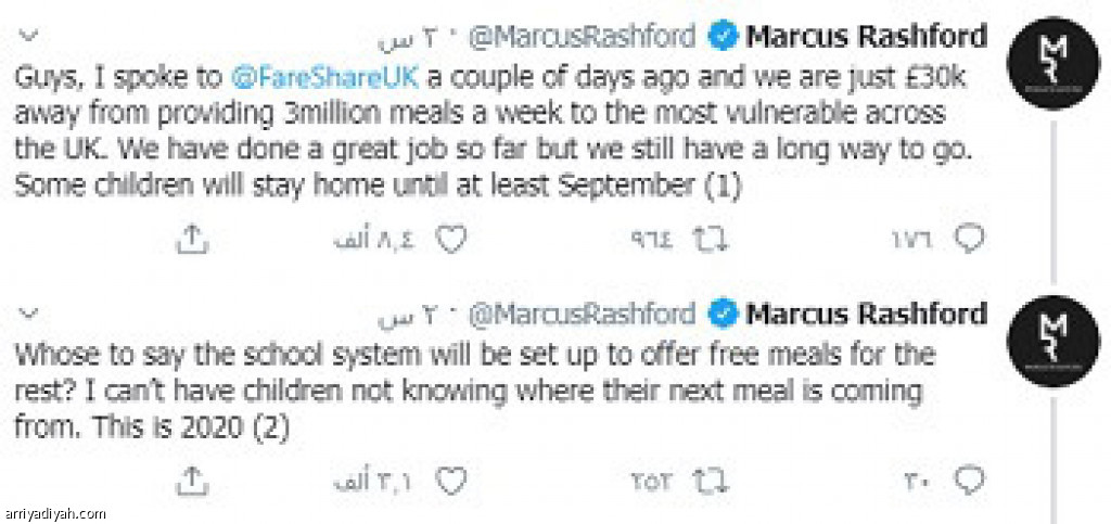 وكتب راشفورد عبر حسابه قائلا: “تحدثت مع جمعية فاير شاير الخيرية قبل أيام، ونحن على بُعد أقل من 30 ألفًا من تقديم ثلاثة ملايين وجبة أسبوعيًّّا للأطفال المحتاجين في بريطانيا. عملنا بجدٍّ، وما زال أمامنا طريقٌ طويل”.