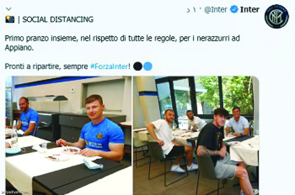بث حساب نادي إنتر ميلان الإيطالي، على موقع التواصل الاجتماعي “تويتر”، صورًا للاعبيه أثناء تناولهم وجبة الغداء في النادي وجلوسهم متباعدين، فيما علق بقوله “غداء بتطبيق قواعد التباعد الاجتماعي”.