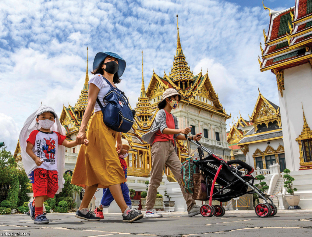 صورة التقطت أمس لزوار يرتدون أقنعة وجه في طريقهم إلى القصر الكبير في بانكوك بعد إعادة افتتاحه عقب تخفيف قيود الإغلاق لوقف انتشار فيروس كورونا في تايلاند