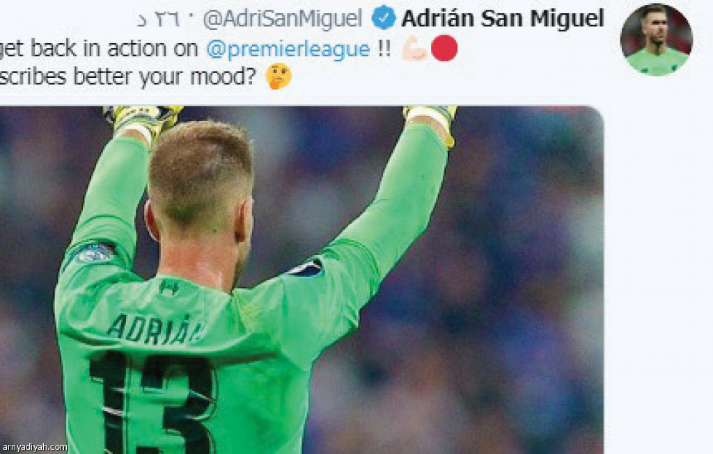 طالب الإسباني أدريان حارس فريق ليفربول من متابعيه عبر حسابه على تويتر بمشاركتهم حالتهم المزاجية، إذ نشر صورة له وعلق عليها بقوله: “بعد العودة إلى العمل أي الرموز التعبيرية تصف حالتك المزاجية بشكل أفضل؟”.