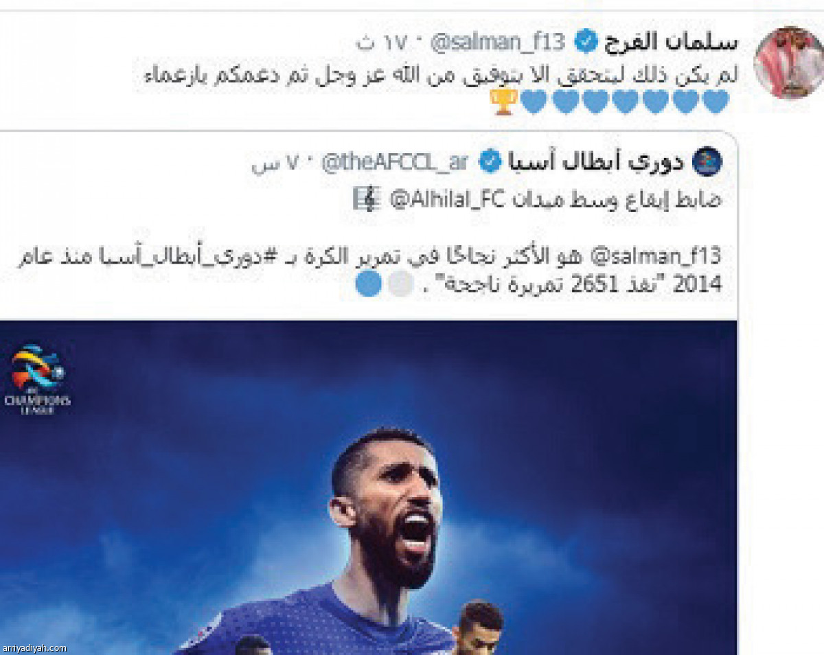 استعاد حساب دوري أبطال آسيا عبر “تويتر” ذكريات تألق سلمان الفرج، لاعب الهلال في البطلوة، حيث نشر تغريدة قال فيها: “ضابط الإيقاع وسط الميدان.. هو الأكثر نجاحًا في تمرير الكرة في البطولة منذ عام 2014،ونفذ 2651 تمريرة ناجحة”.
