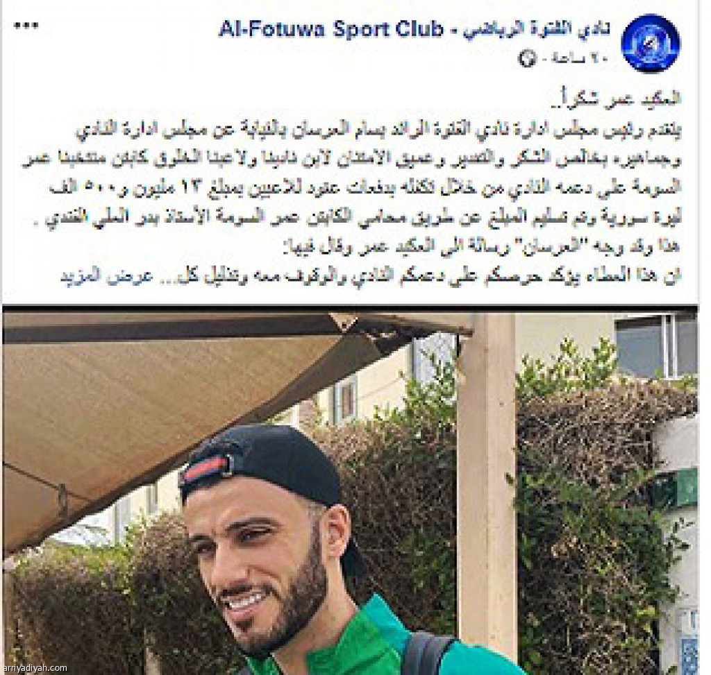 كشف نادي الفتوة السوري عن أن عمر السومة، مهاجم فريق الأهلي الأول لكرة القدم، تكفل بدفع عقود لاعبيه، التي تبلغ نحو 100 ألف ريال.