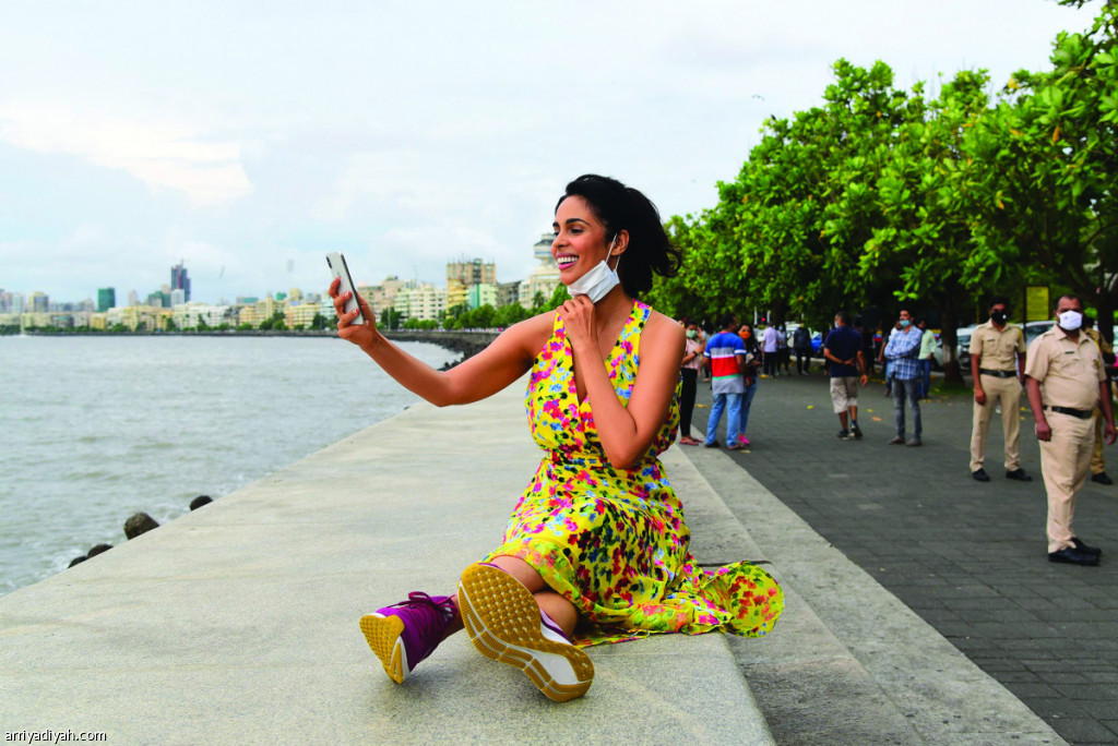 صورة التقطت لماليكا شيراوات الفنانة الهندية تأخذ “سيلفي” أثناء جلوسها على الواجهة البحرية في ضاحية مارين درايف في مدينة مومباي وتظهر ملتزمةً بالإجراءات الاحترازية من فيروس كورونا المستجد