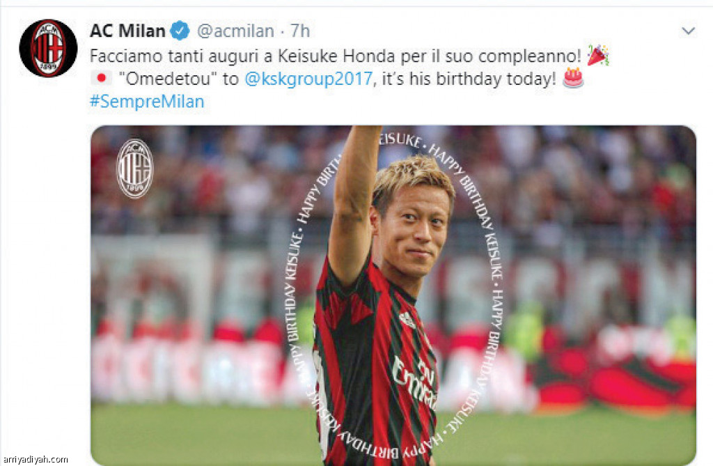 احتفل نادي ميلان الإيطالي أمس على حسابه في تويتر بالذكرى الـ 34 لميلاد الياباني كيسوكي هوندا لاعب الفريق الأول السابق. ونشر الحساب صورة اللاعب بقميص الفريق الذي غادره في 2017.