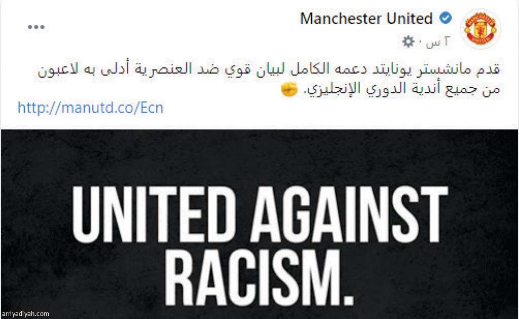 عبر نادي مانشستر يونايتد الإنجليزي أمس على حسابه في فيسبوك عن دعمه الكامل لبيان قوي ضد العنصرية أدلى به لاعبون من جميع أندية الدوري الإنجليزي لكرة القدم.