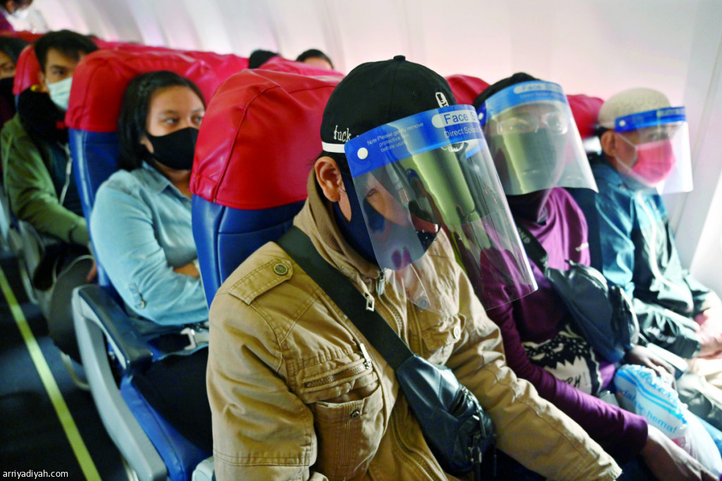 صورة التقطت أمس لمسافرين يرتدون أقنعة الوجه خلال رحلة جوية محلية لشركة ليون آير الإندونيسية من مدينة تانجيرانج إلى باليمبانج (الفرنسية)