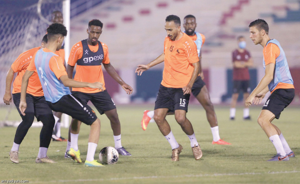صورة التقطت أمس للاعبي الاتفاق يؤدون تدريبات تكتيكية تعتمد على اللمسة الواحدة (المركز الإعلامي ـ الاتفاق)