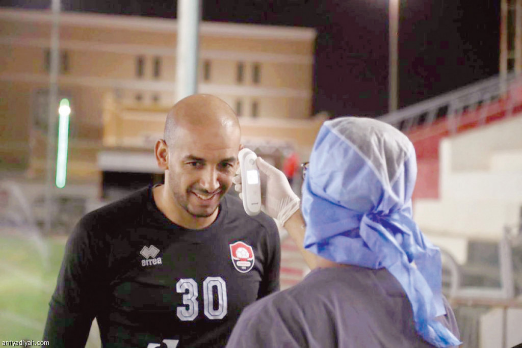 صورة التقطت أمس للجزائري عز الدين دوخة حارس مرمى فريق الرائد الأول لكرة القدم يخضع لاختبار قياس درجة الحرارة قبل انطلاق التدريب (المركز الإعلامي ـ الرائد)