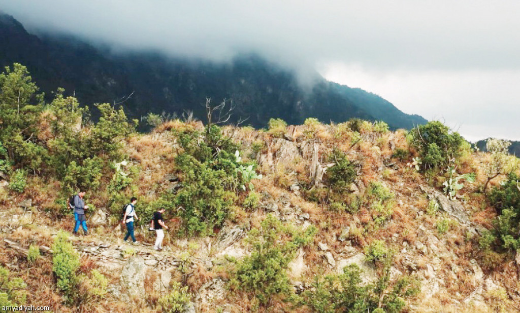 صورة التقطت لعدد من السيّاح يمارسون رياضة الهايكنج في جبال عسير (المركز الإعلامي ـ صيف السعودية)