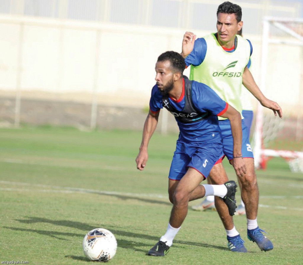 صورة التقطت أمس لأحمد النجعي لاعب وسط فريق أبها يتحرك بالكرة تحت رقابة التونسي كريم العواضي خلال مناورة تحضيرية(المركز الإعلامي ـ أبها)
