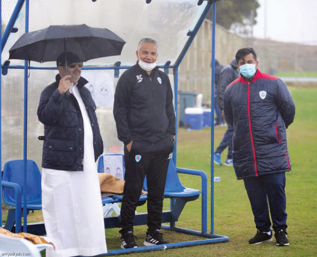 صورة التقطت أمس للتونسي عبد الرزاق الشابي مدرب أبها يعاين التدريب تحت الأمطار متوسطا عبد الله بن شويل نائب المشرف العام وناصر مشلوي إداري الفريق (المركز الإعلامي - أبها)