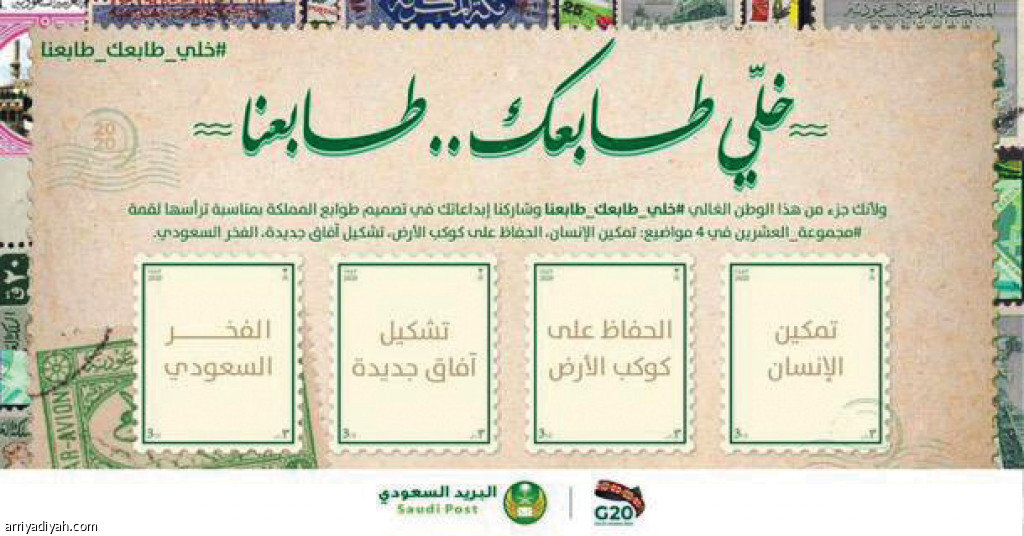 أطلق البريد السعودي بالتعاون مع مجموعة العشرين “G20” مسابقة “خلي طابعك طابعنا” لتحفيز المبدعين من الفنانين والتشكيليين على تصميم طوابع بريدية بمناسبة رئاسة السعودية لقمة مجموعة العشرين “G20”.