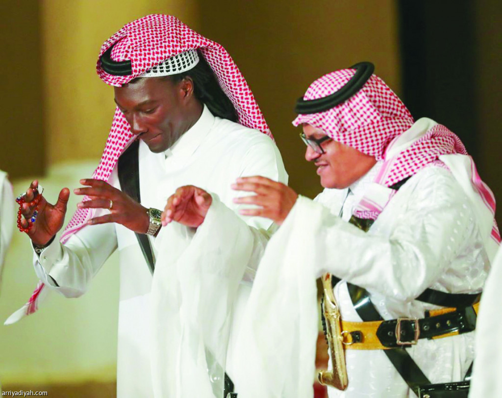 في الصورة يظهر الفرنسي بافيتمبي جوميز مهاجم فريق الهلال يؤدي العرضة السعودية أثناء تصويره إعلان تمديد عقده في أحد منتجعات الدرعية