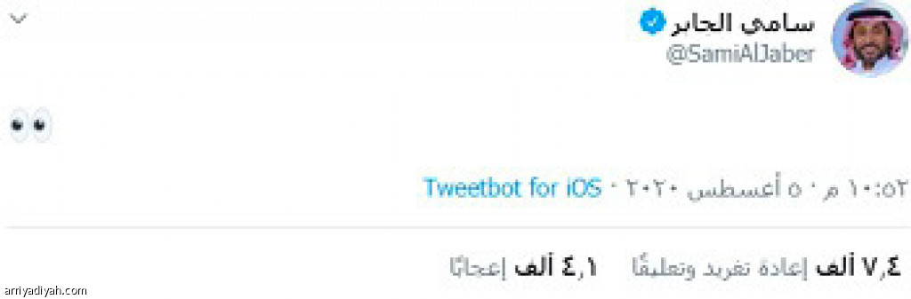 وكان الجابر نشر تغريدته قبل نهاية المباراة بدقائق ووضع فيها أيقونتي “أذنين” فقط، إذ وصلت الردود عليها 4.2 ألف خلال عشرين دقيقة فقط إلى جانب 13 ألف رتويت و17 ألف تفضيل.