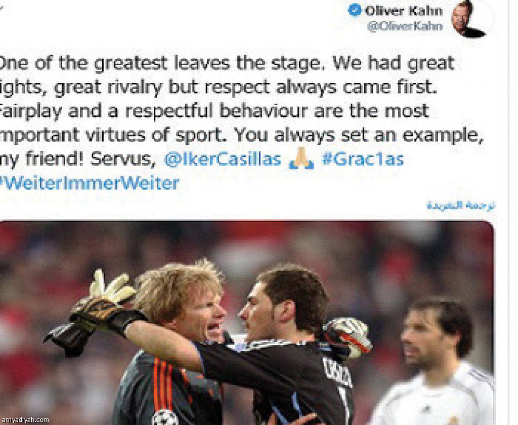 بث الألماني أوليفر كان أسطورة حراسة المرمى عبر حسابه على “تويتر” صورة يعانق فيها الإسباني إيكر كاسياس وعلق على قرار اعتزاله قائلًا “كانت لدينا معارك كثيرة وتنافس كبير، لكن الاحترام كان دائمًا أولًا.. النزاهة والسلوك المحترم هما أهم فضائل الرياضة”.