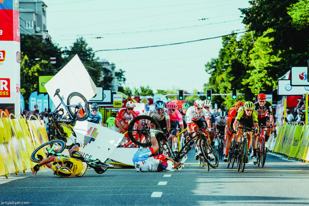 صورة التقطت في 5 أغسطس الجاري وبُثَّت أمس للحظة سقوط ياكوبسن بسبب حادث جروينفيجن الدراج الهولندي في سباق كاتوفيتشي جنوب بولندا (الفرنسية)