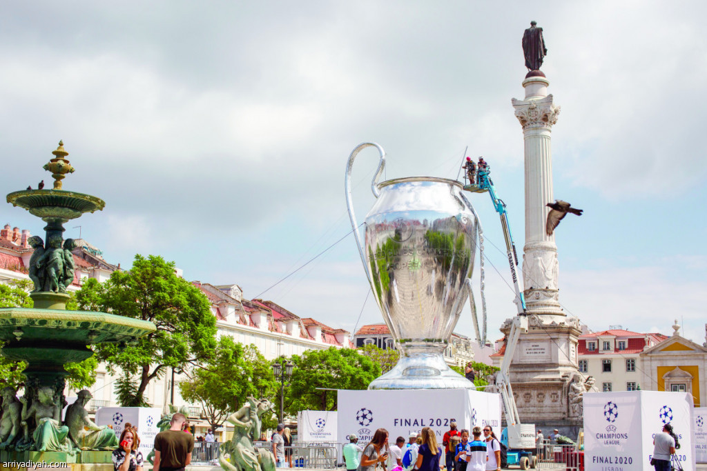 تخوض ثمانية فرق بطولة مصغرة في منافسات دور الثمانية لدوري الأبطال لكرة القدم في لشبونة انطلقت بمواجهة باريس سان جيرمان مع أتلانتا.. وفي الصورة التي التقطت أمس عمال يضعون اللمسات الأخيرة على نسخة عملاقة من كأس دوري الأبطال في وسط لشبونة (الفرنسية)