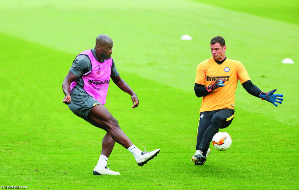 صورة التقطت أمس للوكاكو يسدد الكرة بين أرجل السلوفاني سمير هاندفيتش حارس المرمى حلال الحصة التدربيبة للفريق استعدادًا لمباراة إشبيلية(الفرنسية)