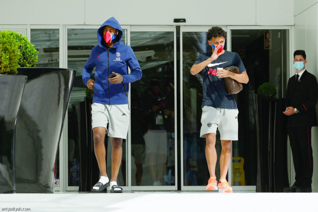 ألغت مفوضية الشرطة في مقاطعة بوش دو رون الفرنسية القرار الذي اتخذته بمنع ارتداء قميص فريق باريس سان جيرمان في مرسيليا، يوم نهائي دوري أبطال أوروبا لكرة القدم أمام بايرن ميونيخ غدًا.. وفي الصورة بريسنيل وماركينيوس لاعبا باريس سان جيرمان في طريقهما إلى ملعب