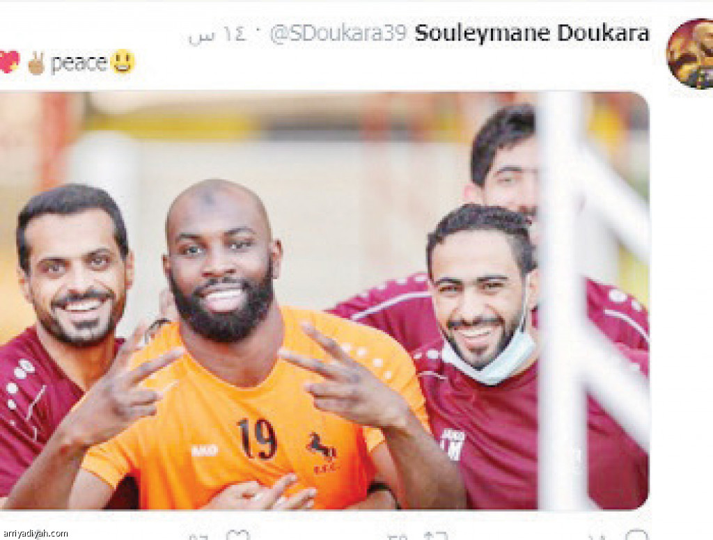 أطلَّ السنغالي سليمان دوكارا، لاعب فريق الاتفاق ، على متابعي حسابه عبر “تويتر” بصورة مع خالد العطوي، مدرب الفريق، وأحمد المالكي، مساعده، وظهروا جميعًا مبتسمين، فيما اكتفى بالتعليق عليها قائلًا: “سلام”.