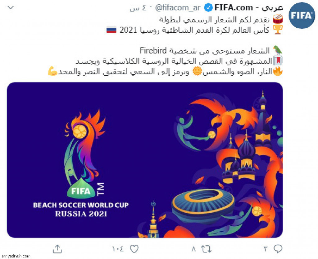 نشر حساب الاتحاد الدولي لكرة القدم “فيفا” على تويتر باللغة العربية صورة شعار بطولة كأس العالم لكرة القدم الشاطئية في روسيا. الشعار مستوحى من طائر النار المشهور في القصص الخيالية الروسية الكلاسيكية.