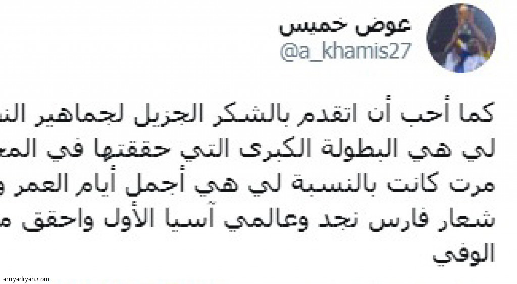 وصف عوض خميس فترته التي قضاها مع النصر بأجمل الأيام في عمره إذ تشرف فيها بالدفاع عن شعار الفريق وحقق البطولات وأسعد الجمهور، وذلك من خلال تغريدات نشرها عبر حسابه على “تويتر” أعلن فيها رحيله وانضمامه إلى نادي الرائد.