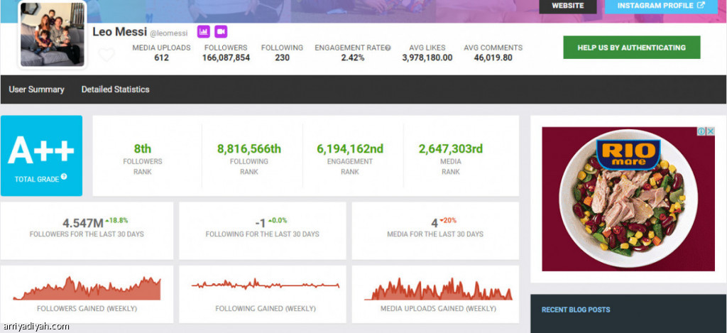 وجمع ميسي على إنستجرام 1.644 مليون ليرفع الرقم الإجمالي إلى 166.087 مليون متابع، منهم 4.547 مليون خلال الثلاثين يومًا الماضية، بزيادة 18.8 في المئة، على الرغم من شح تدويناته التي بلغت 5 فقط. وكان الرقم الأكبر هو 400.916 متابعًا يوم الثلاثاء الماضي، وهو اليوم الذي تأكد فيه رسميًا خبر طلب فسخ العقد.