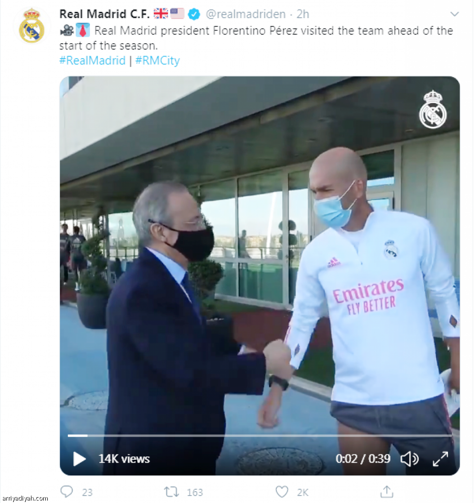 زار فلورنتينو بيريز، رئيس نادي ريال مدريد الإسباني، أمس، مقر تدريبات الفريق الأول لكرة القدم للاطمئنان على سير الاستعدادات للموسم الجديد. ونشر حساب النادي في تويتر مقطع فيديو للزيارة، ولقاء بيريز المدرب واللاعبين.