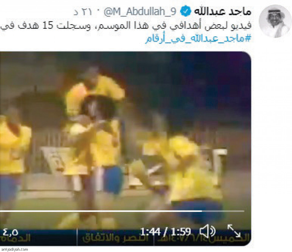 ونشر الدولي السابق مقطعي الفيديو في #ماجدعبداللهفي_أرقام، الذي يوثق فيه تاريخه مع النادي الأصفر والأهداف التي سجلها في جميع المواسم والفرق التي سجل فيها.