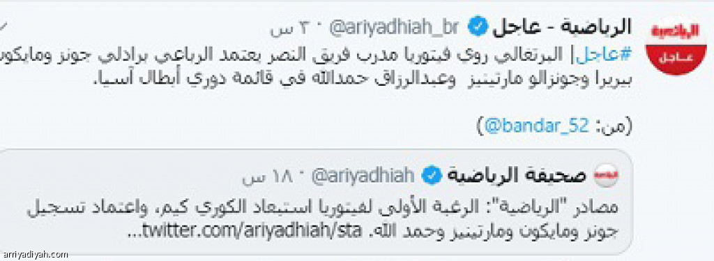 حصدت تغريدة حساب “الرياضية عاجل” في موقع التواصل الاجتماعي تويتر، التي تضمَّنت أسماء اللاعبين الأجانب الأربعة الذين اختارهم البرتغالي فيتوريا، مدرب فريق النصر الأول لكرة القدم، في القائمة الآسيوية، تفاعلًا كبيرًا من المغردين، حيث انتشرت بشكل واسع في الطائر الأزرق.