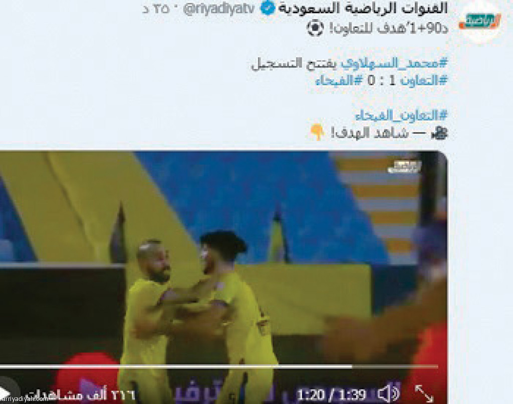 حظي هدف محمد السهلاوي مهاجم فريق التعاون الأول لكرة القدم في شباك الفيحاء والذي أنقذ به فريقه من الهبوط بالمشاهدة الأعلى من بين جميع الفيديوهات التي نشرها حساب القنوات السعودية عن أحداث مباريات أمس بعدد 270 ألف مشاهدة خلال 20 دقيقة.