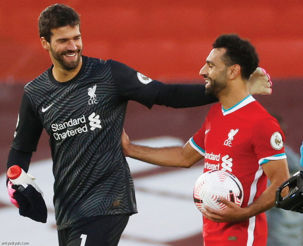 صورة التقطت أمس لمحمد صلاح وأليسون بيكر لاعبَي ليفربول يتبادلان التحية بعد الفوز على ليدز يونايتد 4ـ3
