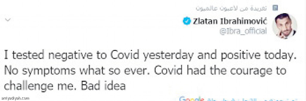 أكد السويدي زلاتان إبراهيموفيتش، مهاجم فريق ميلان الأول لكرة القدم، أن فيروس كورونا أراد تحديه بعد أن جاءت نتيجة فحصه إيجابية أمس . وقال في تدوينة عبر حساباته على السوشال ميديا: “لقد كانت نتيجة اختبار كوفيد سلبية أمس وإيجابية اليوم. لا توجد أعراض على الإطلاق. فيروس كورونا قرر أن يتحداني.. فكرة سيئة”.