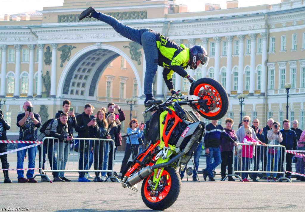 اختُتِمَ موسم ركوب الدراجات النارية السنوي في سان بطرسبرج في روسيا بتنظيم مهرجان لعروض مهارات فن القيادة والحركة.. وفي الصورة التي التقطت أمس سائق دراجة نارية يستعرض مهاراته في إحدى ساحات المدينة في نهاية الموسم