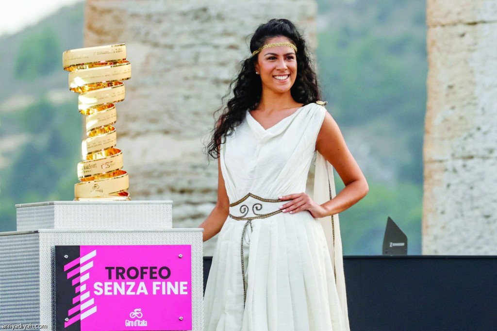 ينطلق سباق “جيرو دي إيطاليا” أشهر سباقات الدراجات في العالم غدًا، بعد تأجيله أكثر من مرة بسبب جائحة فيروس كورونا.. وفي الصورة التي التقطت أمس، عارضة ترتدي الزي الروماني وتقف إلى جانب كأس السباق أثناء العرض التقديمي في حديقة سيجيستا الأثرية في صقلية