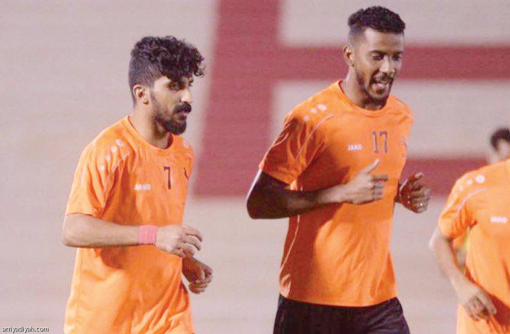 صورة التقطت أمس لمحمد الكويكبي مهاجم فريق الاتفاق الأول لكرة القدم يؤدي تدريب الإحماء وبجانبه صالح القميزي قبل انطلاق التدريبات (المركز الإعلامي ـ الاتفاق)