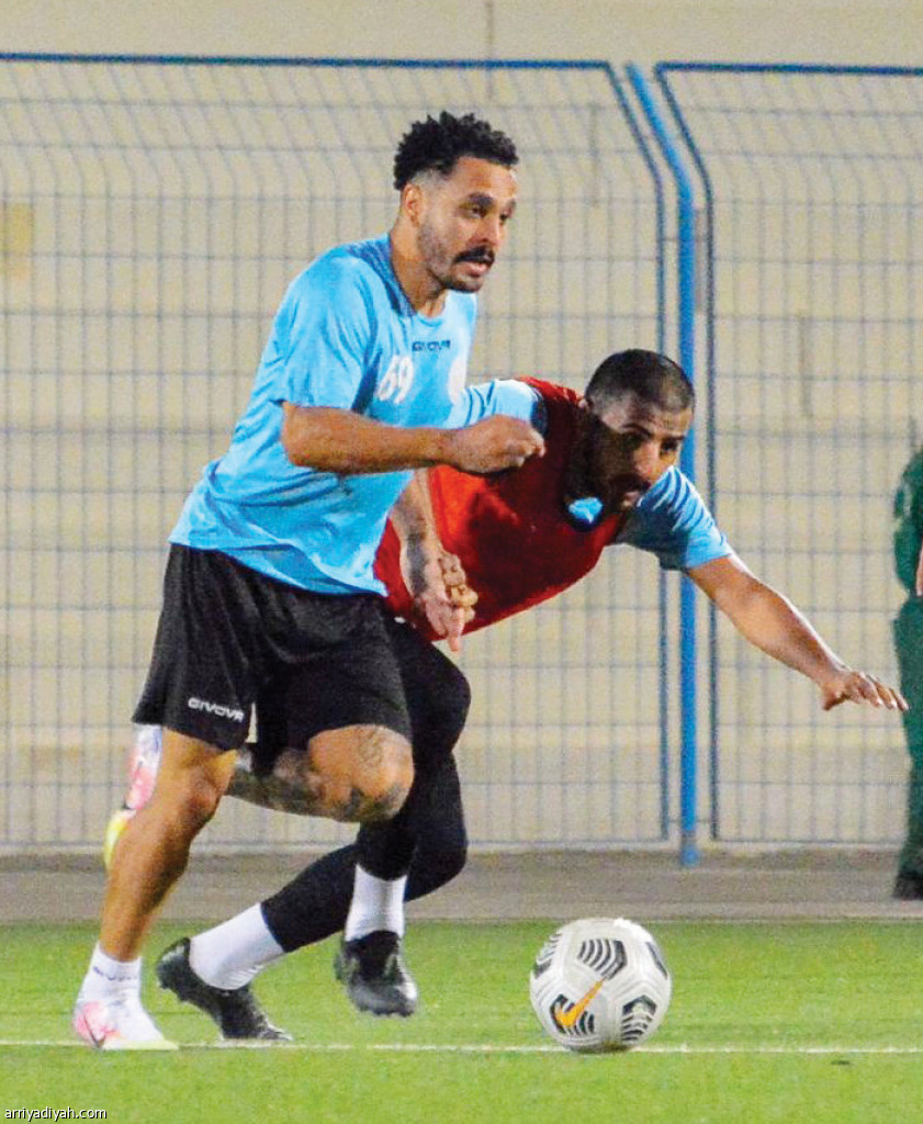 صورة التقطت أمس لميراندا ومحمد البكر لاعبي الجبلين يتنافسان للحصول على الكرة أثناء التدريبات (المركز الإعلامي ـ الجبلين)