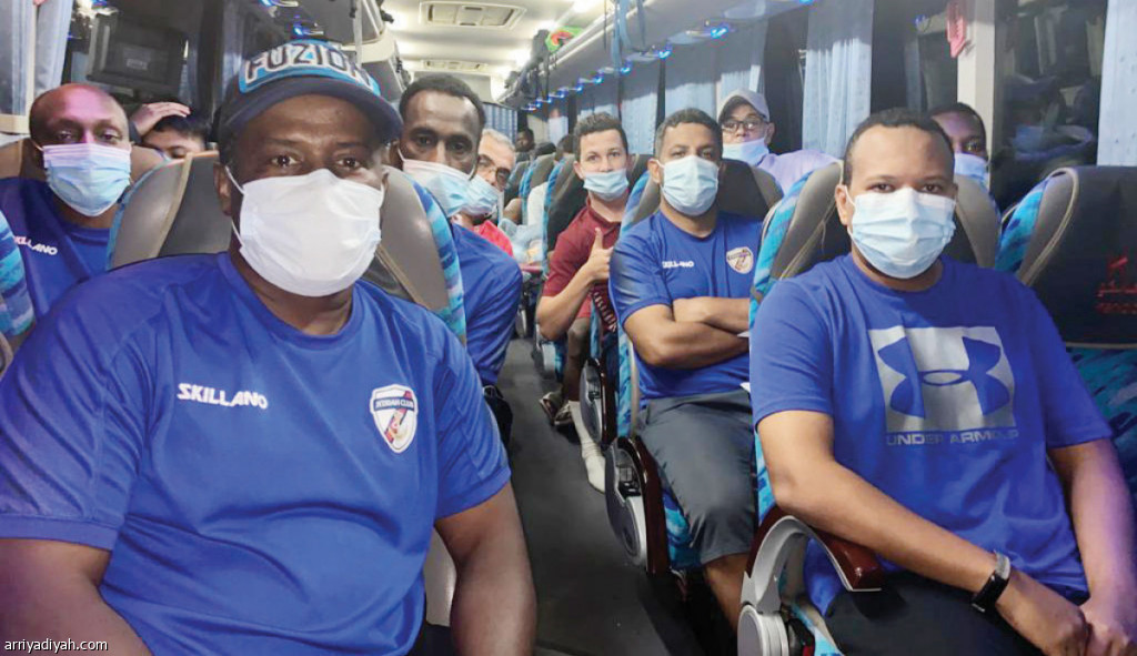 صورة التقطت أمس للاعبي جدة داخل الحافلة التي أقلتهم إلى المدينة المنورة (صورة خاصة بالرياضية)