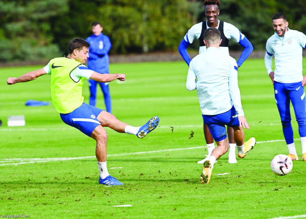 صورة التقطت أمس للإسباني سيزار أزبليكويتا مدافع فريق تشيلسي، يسدد الكرة أثناء الحصة التدريبية لفريقه استعدادًا لمباراة ساوثهامتون في الدوري غدًا (المركز الإعلامي ـ تشيلسي)