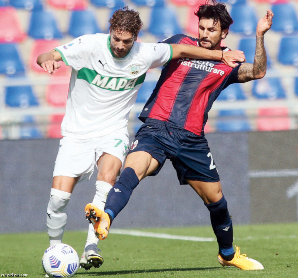 صورة التقطت أمس لروبرتو سوريانو لاعب بولونيا ومانويل لوكاتيللي لاعب ساسوولو يتنافسان على الكرة خلال المباراة التي جرت على ملعب ريناتو دالارا في بولونيا (أسوشيتدس برس)